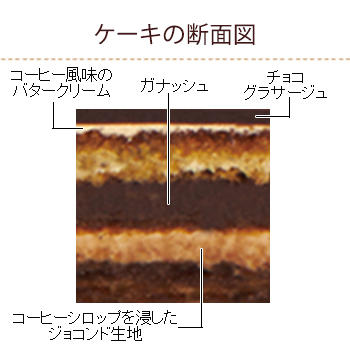 コーヒーシロップを浸したジョコンド生地3層、コーヒー風味のバタークリーム2層、ガナッシュ1層、グラサージュ1層の7層からなる、濃厚な味わい。