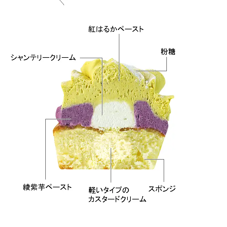 軽いタイプのカスタードクリームをスポンジに入れ、鹿児島県産綾紫ペーストと茨城県産紅はるかペーストを絞りました。
