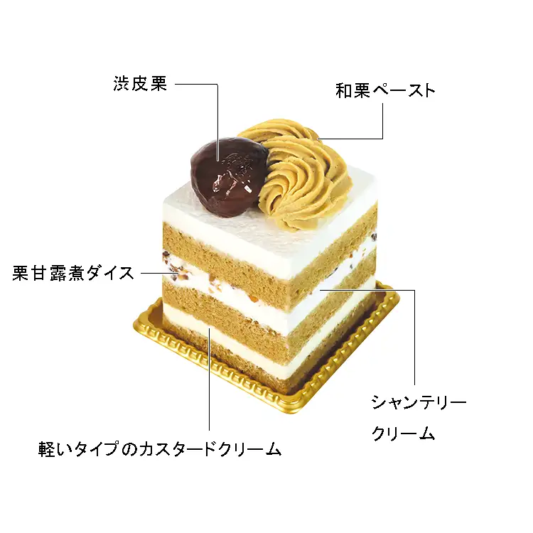 コーヒースポンジに軽いタイプのカスタードクリームとシャンテリークリームを重ね、ダイス状の栗甘露煮をサンドしました。