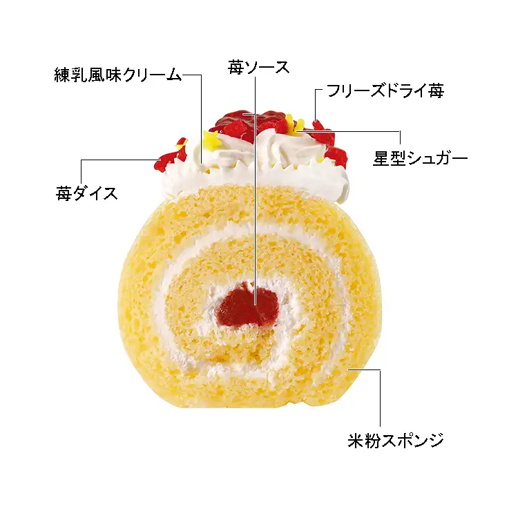 苺ソースと練乳風味クリームを米粉スポンジで巻きました。上部は苺ダイス、苺ソース、フリーズドライ苺、星型シュガーをトッピングしました。