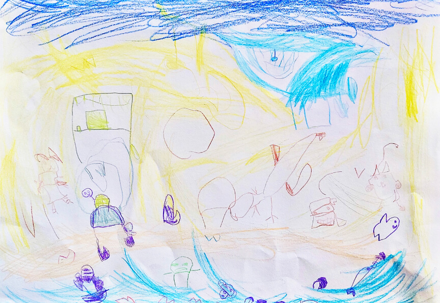 みさきとママで、海のテーマパークで遊んでいる絵です。真ん中にいるのがみさきが考えたキャラクターの「ひゃこと」です。その上でタコが結婚式をしているところです。