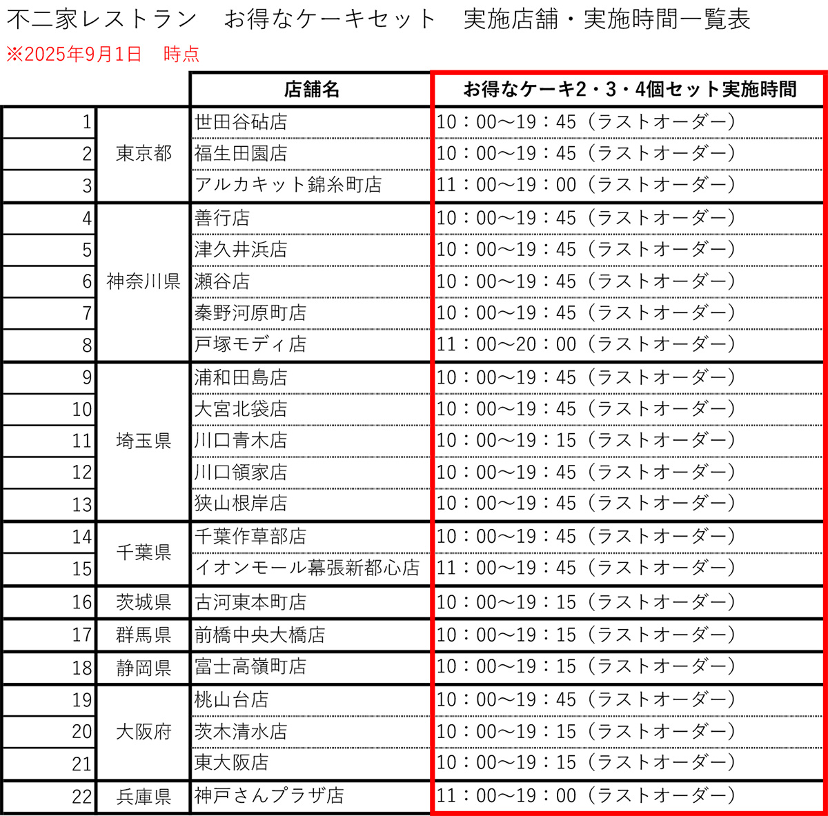 ※ ケーキの内容は季節により異なります。 ※ ご注文いただいたご本人様のみのお召し上がりとなります。お取り分けはご遠慮願います。 ※ ケーキの数量には限りがございますので、売切れの際はご容赦ください。 ※ 店舗によりお取扱いできない商品がございますので、ご了承ください。 ※ お得なケーキセットの商品のお持ち帰りはできません。 ※ 詳しくは各店舗にお問い合わせください。 ※戸塚モディ店は洋菓子販売はカットケーキのみ、取り扱っております。 現在の実施店舗・実施時間